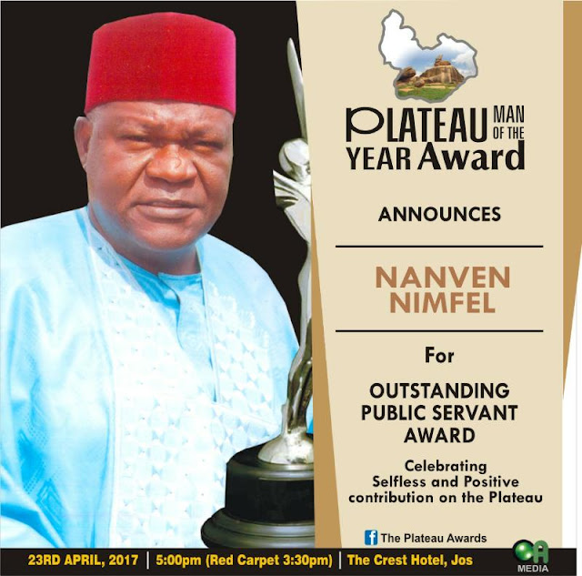 COA MEDIA the organizers of the 2017 Face Of Plateau beauty pageant, announces RT.Hon Simon Bako Lalong the executive Governor of Plateau as the recipient of the Plateau Man Of The Year Award alongside Rochas, bishop Kwashi,I D Gyang, Steve Gukas, Chu Bagu, Nanven Nimfel, Nenle Gujor, Hon Mafeng Gwallson, Sani Mu’azu etc. For their contribution to the development, peace and unity on the Plateau State, the award will take place at Crest Hotel, Jos, with red carpet starting by 3:30 while events starts by 5 pm.