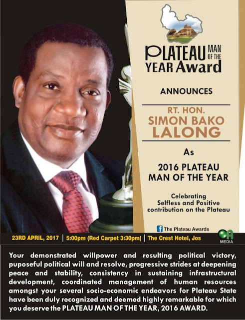 COA MEDIA the organizers of the 2017 Face Of Plateau beauty pageant, announces RT.Hon Simon Bako Lalong the executive Governor of Plateau as the recipient of the Plateau Man Of The Year Award alongside Rochas, bishop Kwashi,I D Gyang, Steve Gukas, Chu Bagu, Nanven Nimfel, Nenle Gujor, Hon Mafeng Gwallson, Sani Mu’azu etc. For their contribution to the development, peace and unity on the Plateau State, the award will take place at Crest Hotel, Jos, with red carpet starting by 3:30 while events starts by 5 pm.