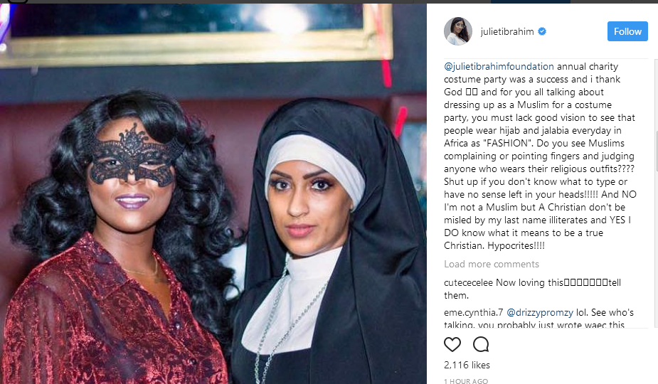 Once upon a time I forgot I live in the part of the world where the uneducated ones always feel they understand and know it all and could do better when they were put in someone else’s shoes. They won’t even go and research the meaning of Costume Party to understand and know before coming online to preach holiness and religion! Bible quoters, in which part of the Bible was it written that this costume was made to be glorified and must be glorified and NOT used as a costume? People typing gibberish are nothing but Fake Christians as the Bible I do know says “Do not judge your neighbour ” ” let he who is without sin be the first to cast his stone”!!!! People over decades have used this costume in all sorts of ways and for dirty deeds and oh yes in the western world people do know the meaning of Costume Party! You sinners need to come to me for prayers obviously! Fake Christians always ready to bully others into their nonsense archaic beliefs of their socalled version of their own Bible. I’ll post more pictures and I’ll throw more costume parties and use those parties to raise funds for the less privileged through my parties, if you don’t like go and hug a goat for all I care. After insulting and judging your fellow human being una will go to church on a Sunday to pray and ask God to bless and change your pathetic lives? Please plug out the log in your eye first, sinners!@julietibrahimfoundation annual charity costume party was a success and i thank God ?? and for you all talking about dressing up as a Muslim for a costume party, you must lack good vision to see that people wear hijab and jalabia everyday in Africa as “FASHION”. Do you see Muslims complaining or pointing fingers and judging anyone who wears their religious outfits???? Shut up if you don’t know what to type or have no sense left in your heads!!!!! And NO I’m not a Muslim but A Christian don’t be misled by my last name illiterates and YES I DO know what it means to be a true Christian. Hypocrites!!!!